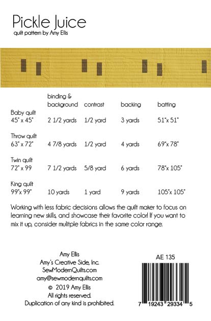 Pickle Juice is a simple, graphic quilt that can be made in any color combination you desire! I can’t wait to see your favorite colors together! The background fabric. includes the binding too. Make your choices and get started!